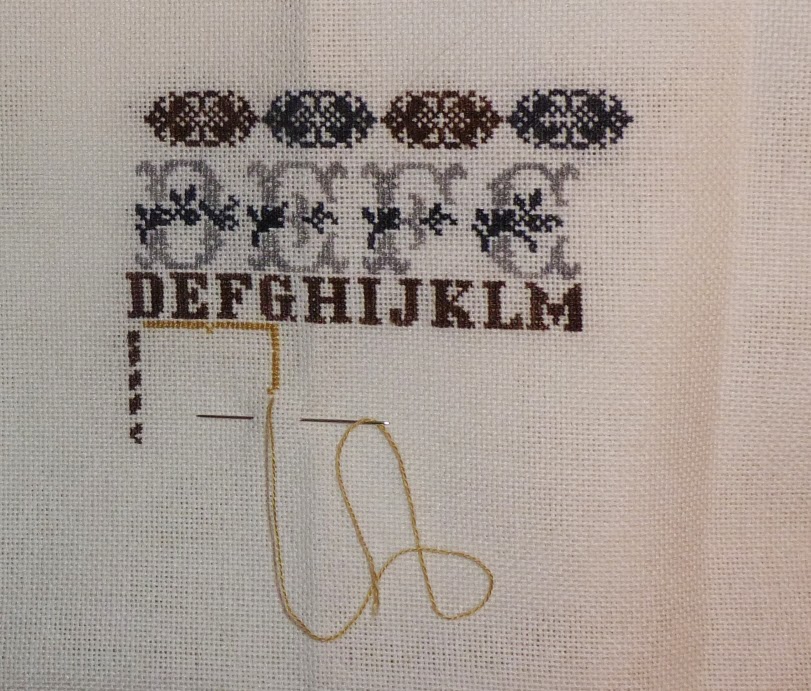 | 28 ct cream luguna, with Denim dark & med Gumnuts thread |